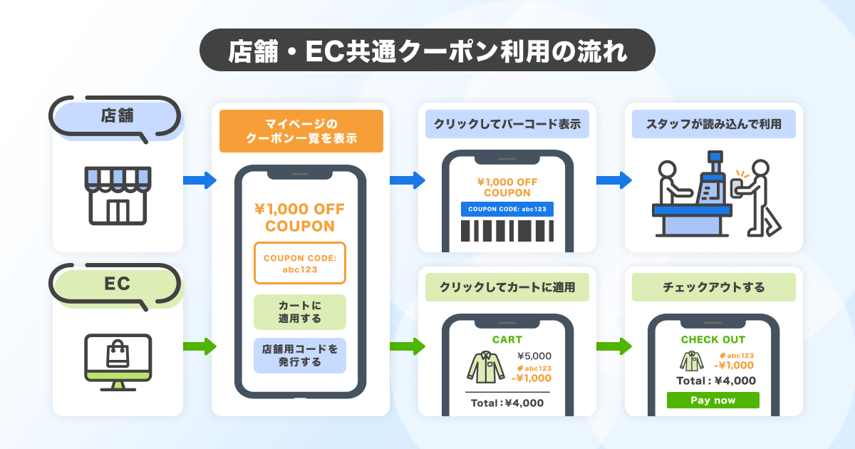 本記事では、クーポン配布の基本的な考え方を整理したうえで、「店舗とECで共通のクーポンを発行する」ことで実現できる施策について解説します。