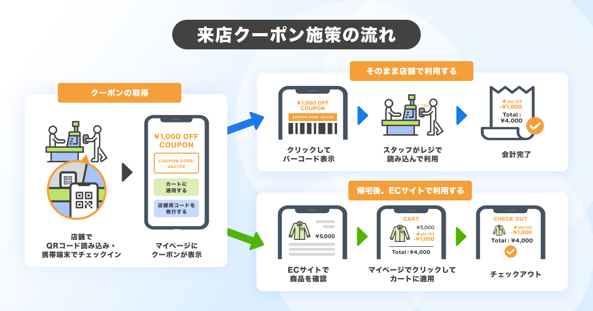店舗で商品を見たが、購入する踏ん切りがつかなかったとしても、オンラインストアで同じようにクーポンが利用できることで、「ECサイトで改めて商品を見て購入する」という体験もスムーズに提供できるようになります。