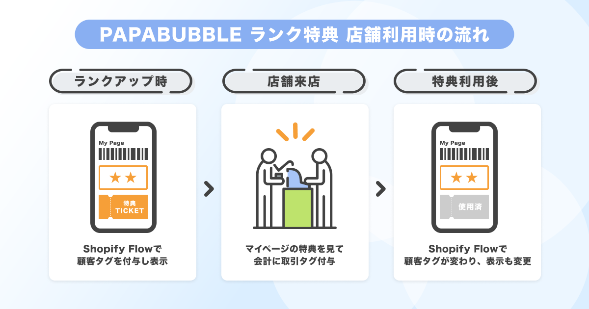 ランクごとの特典をお客さまに表示することから、店舗で利用すること、利用済みかどうかの判定までを、「らんキィ」「Omni Hub」「Shopify Flow」を活用して連携させ、すべて自動的に運用できる仕組みを構築しています。